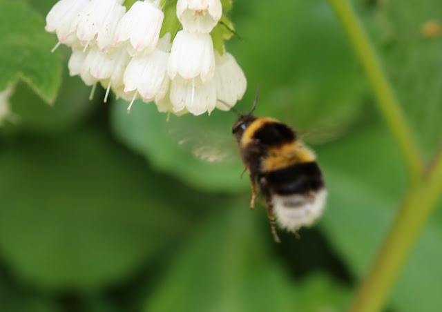 I started in the garden at the comfrey plants. Comfrey always attract bees and I did not have to wait long before a Bumblebee appeared and started flitting from flower to flower. I decide my best bet for identification was to obtain a photo of each species as I encountered them. This however was a lot harder than you might imagine. Bees move quickly and sometimes erratically and unless the flower is open then they have a tendency to disappear from view.